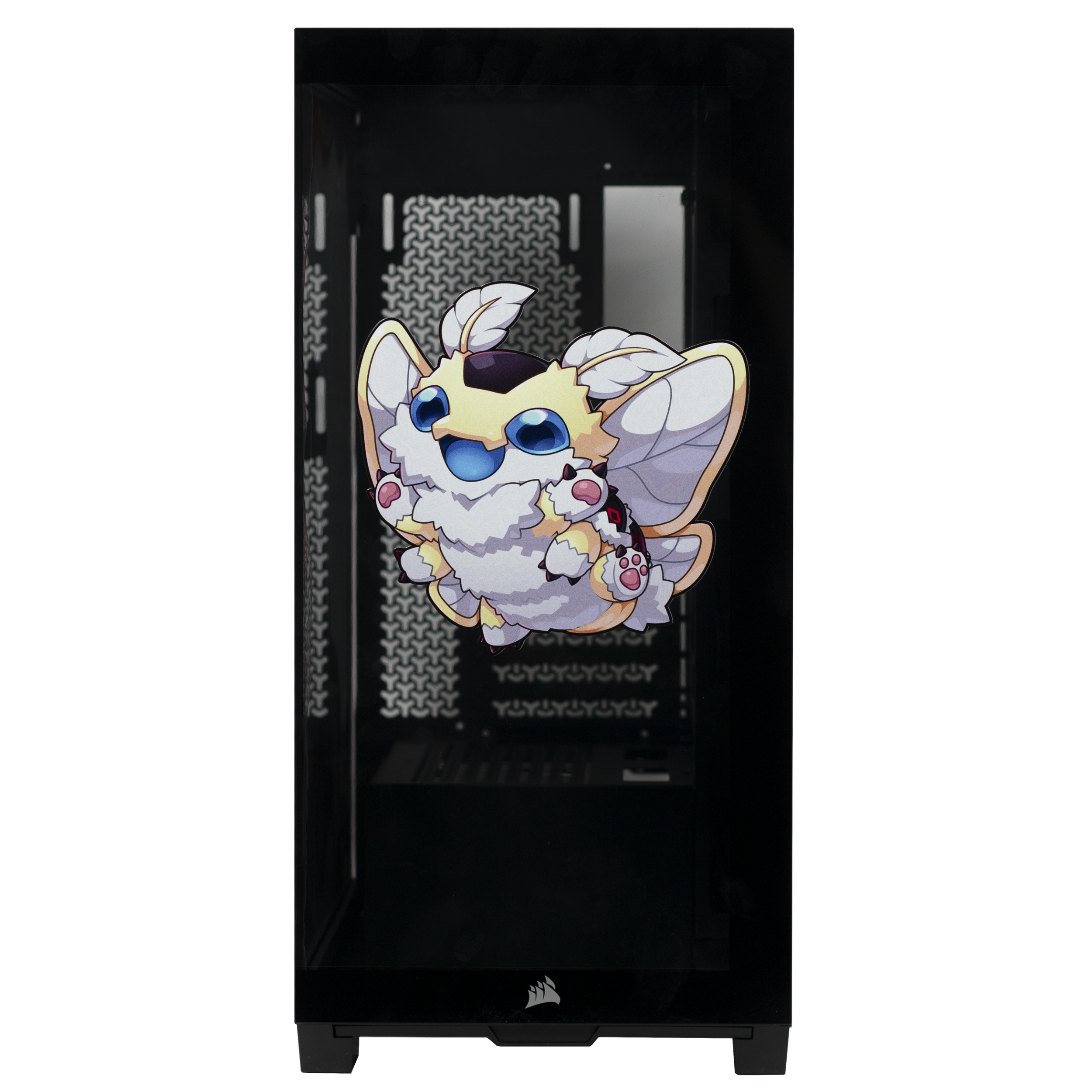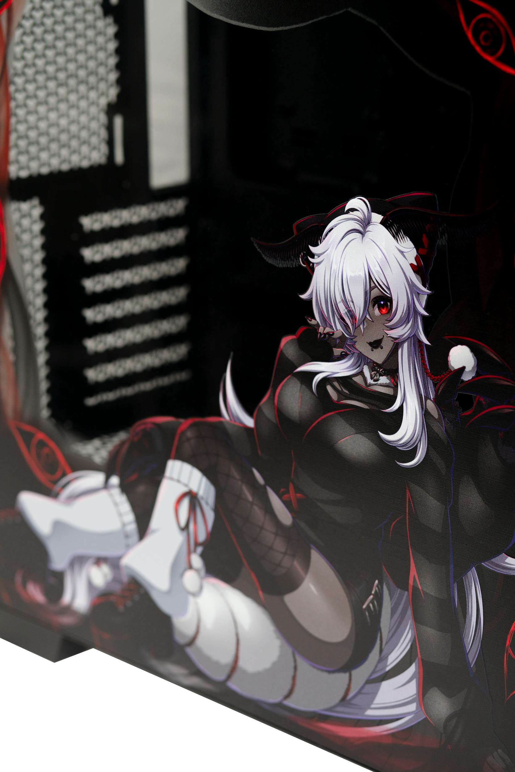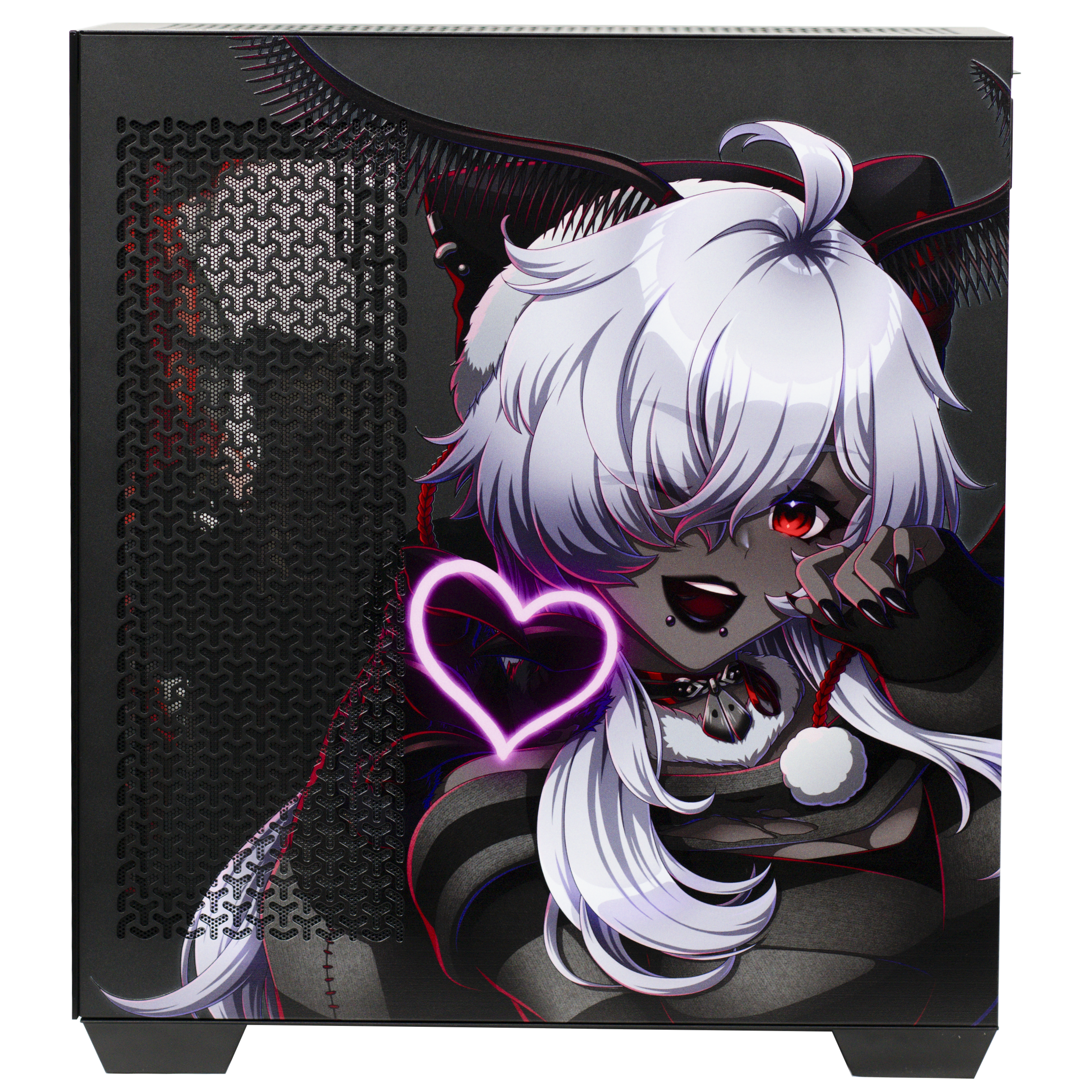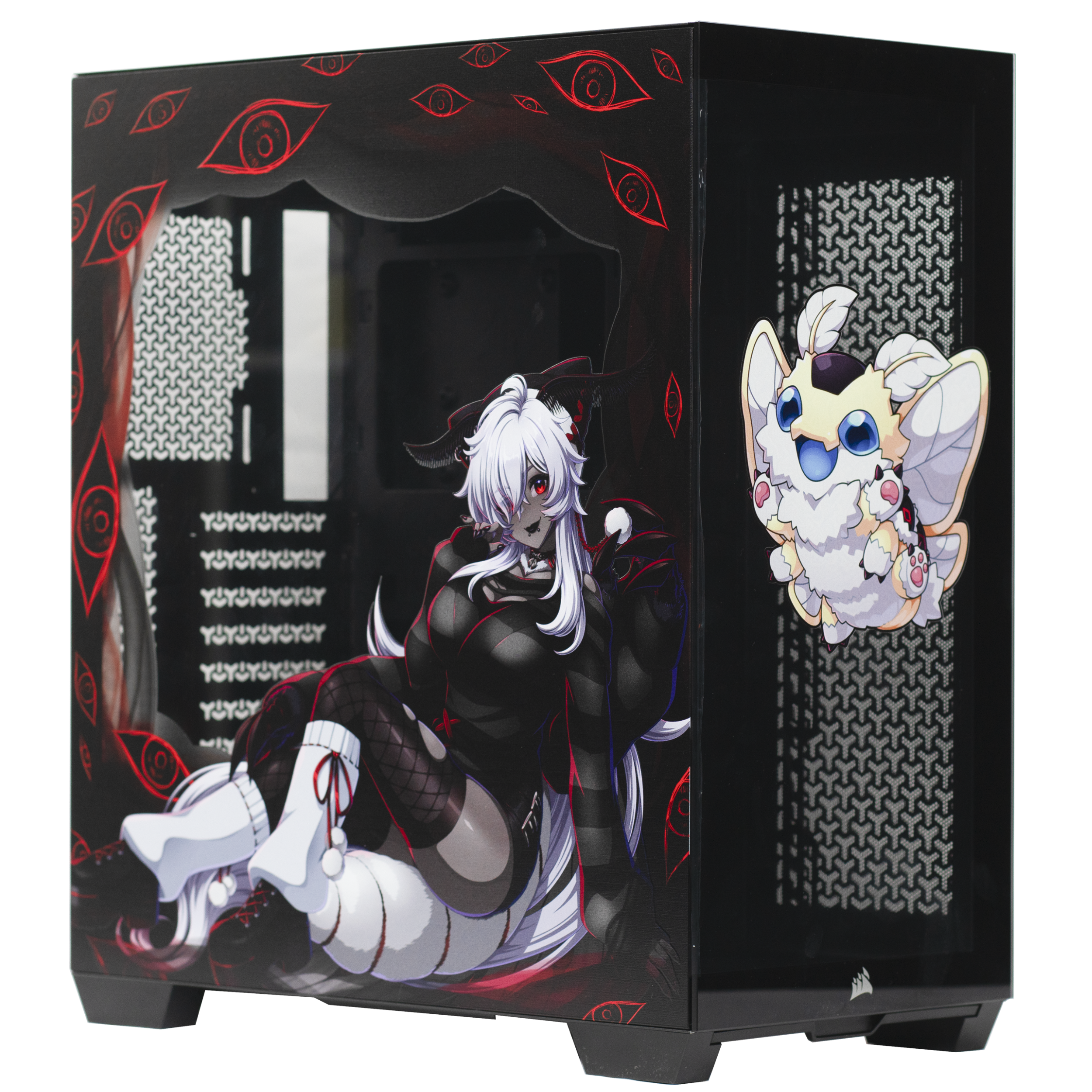 Step into the cryptid twilight of FenariMori’s realm with this exclusive collaboration PC case, designed as a tribute to her eerie charm and signature moth-inspired aesthetic. Wrapped in deep reds and shadowed blacks, the case features FenariMori seated in her iconic mysterious pose, framed by watchful eyes and occult patterns that echo her cryptid roots. Her adorable moth companion brightens the opposite panel, adding a playful contrast to the case’s haunting elegance.