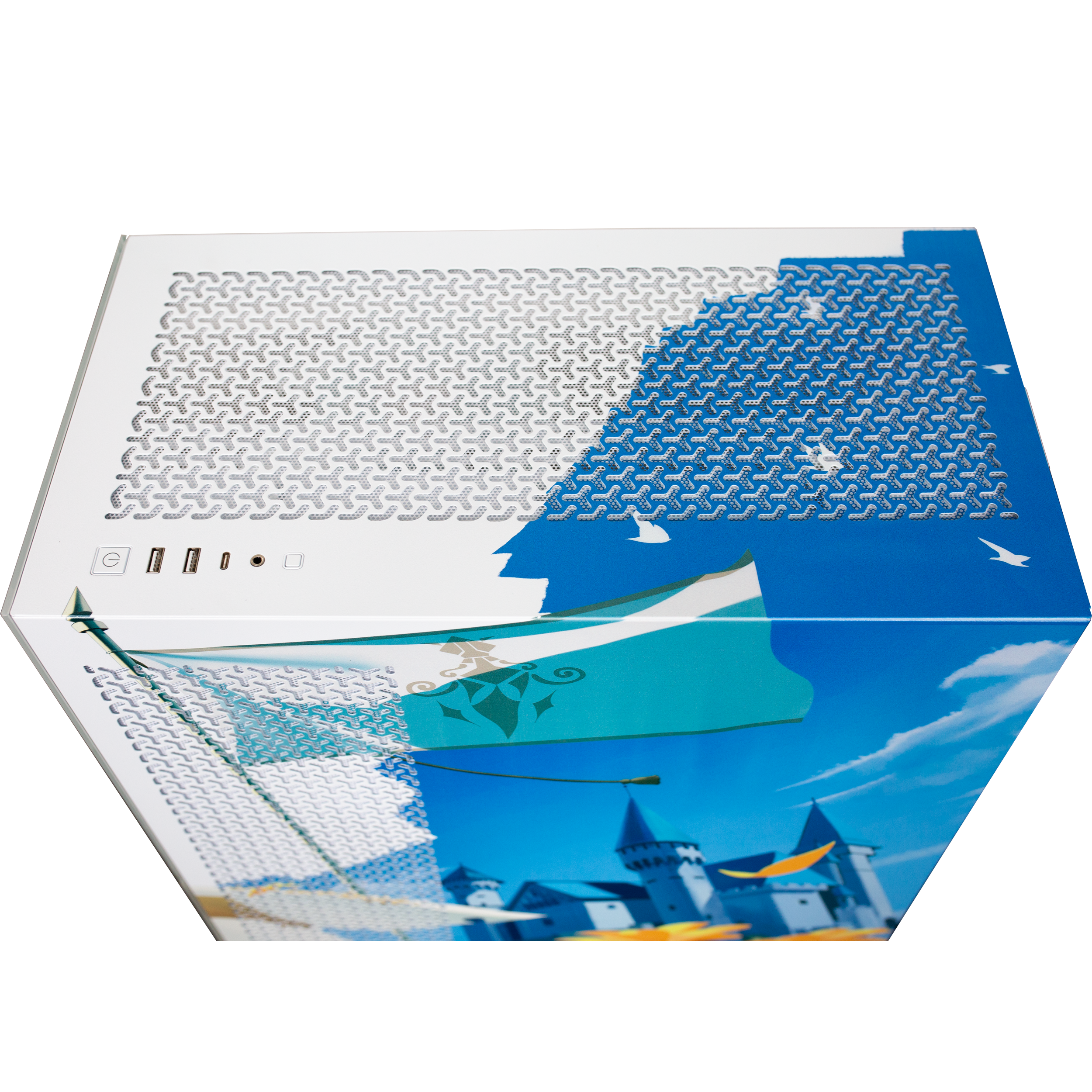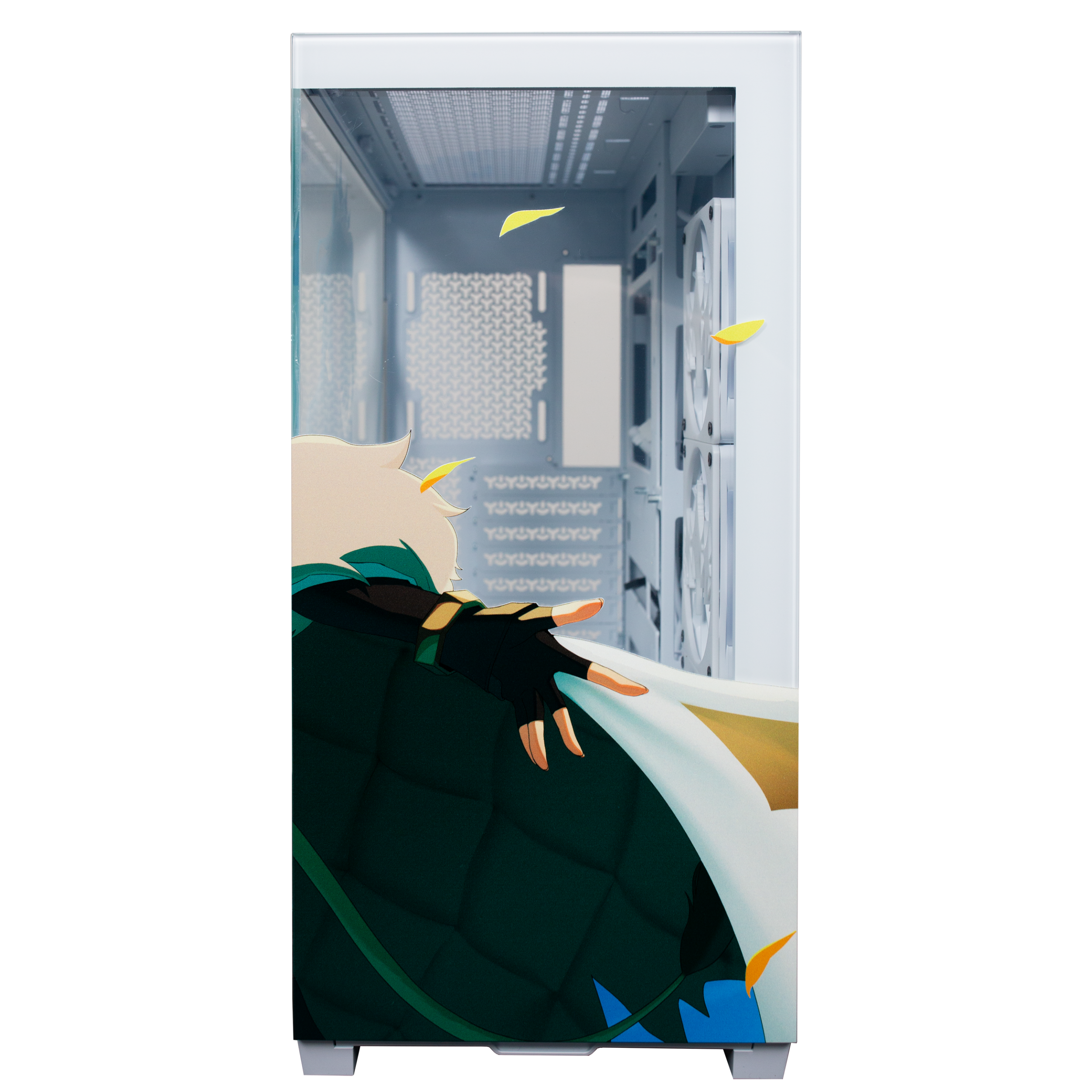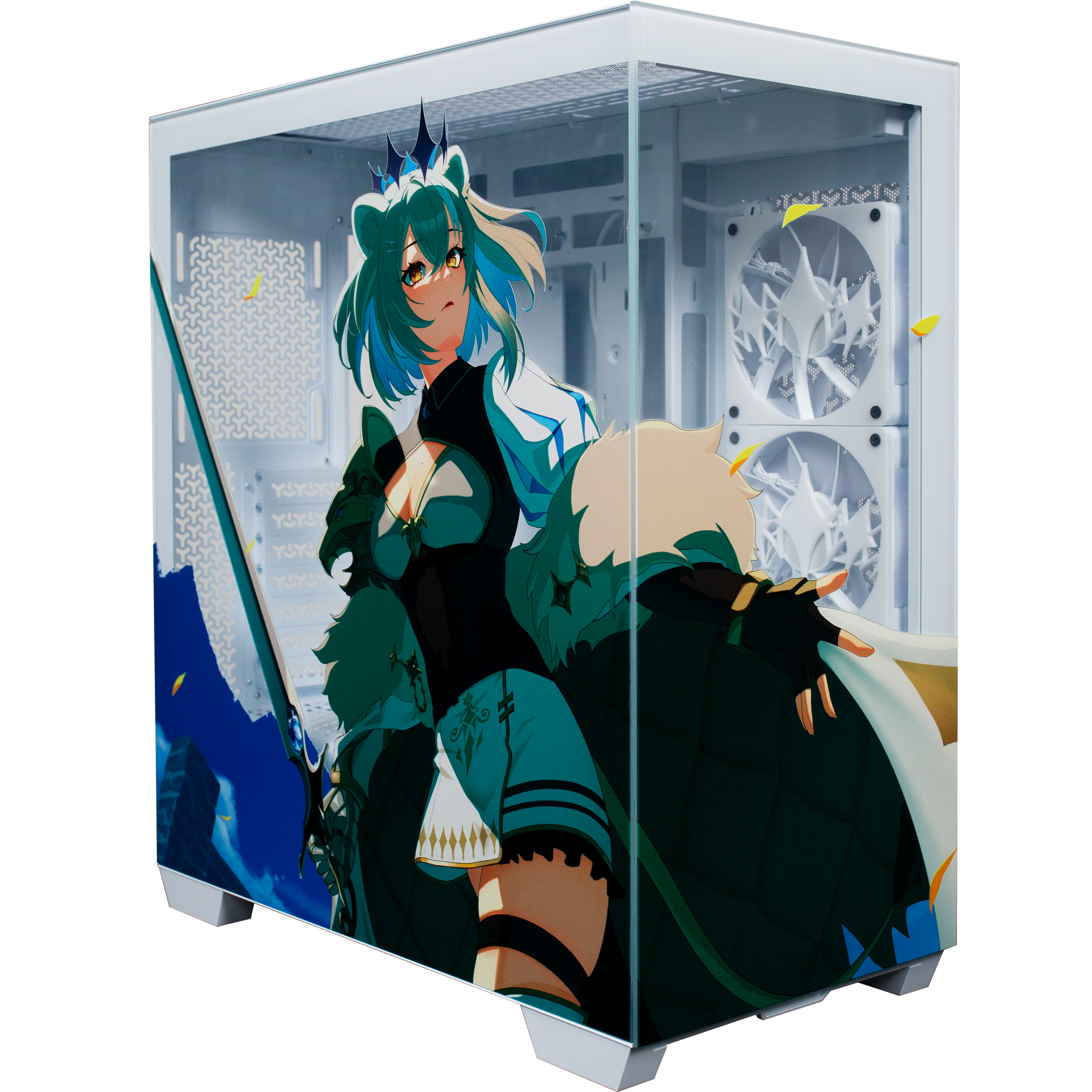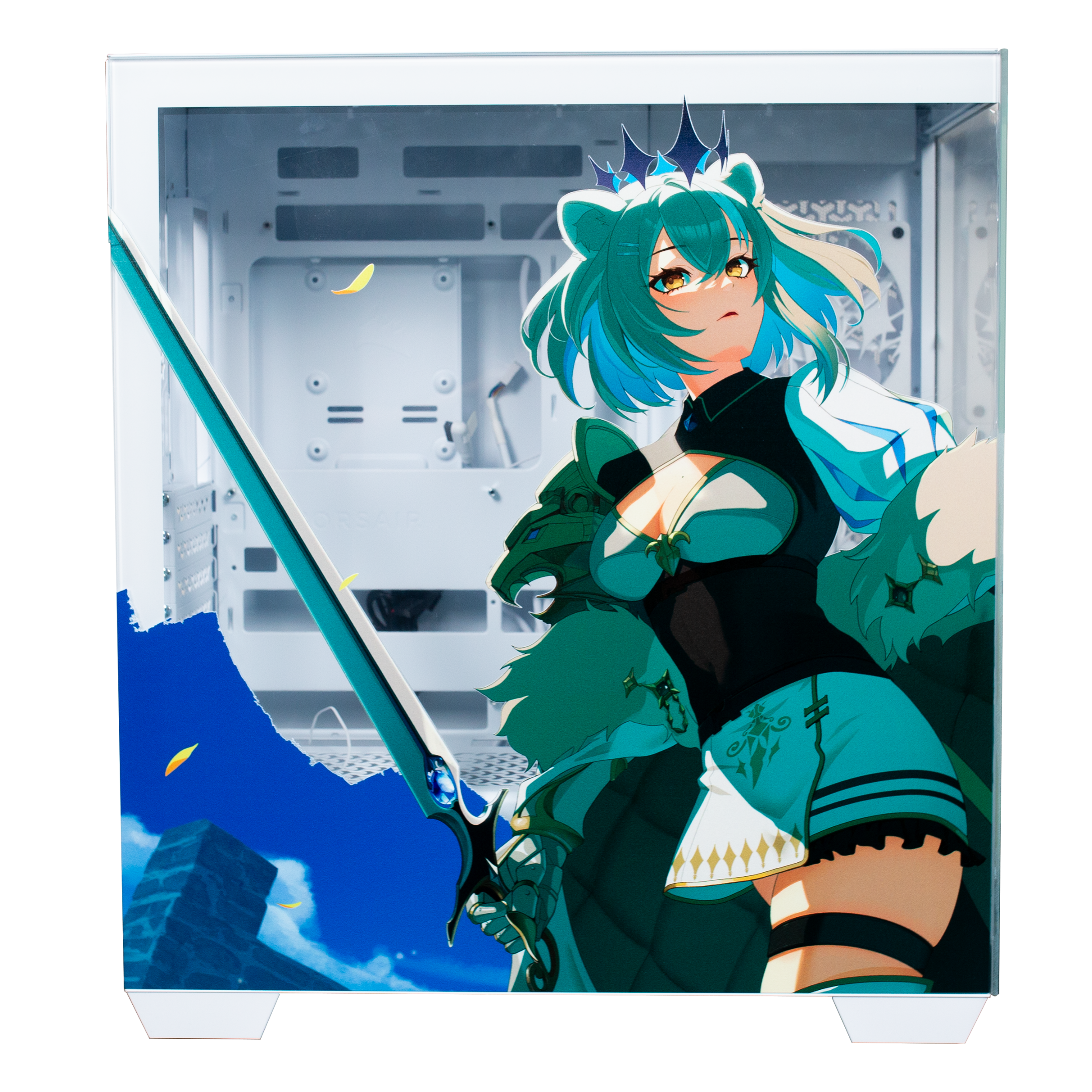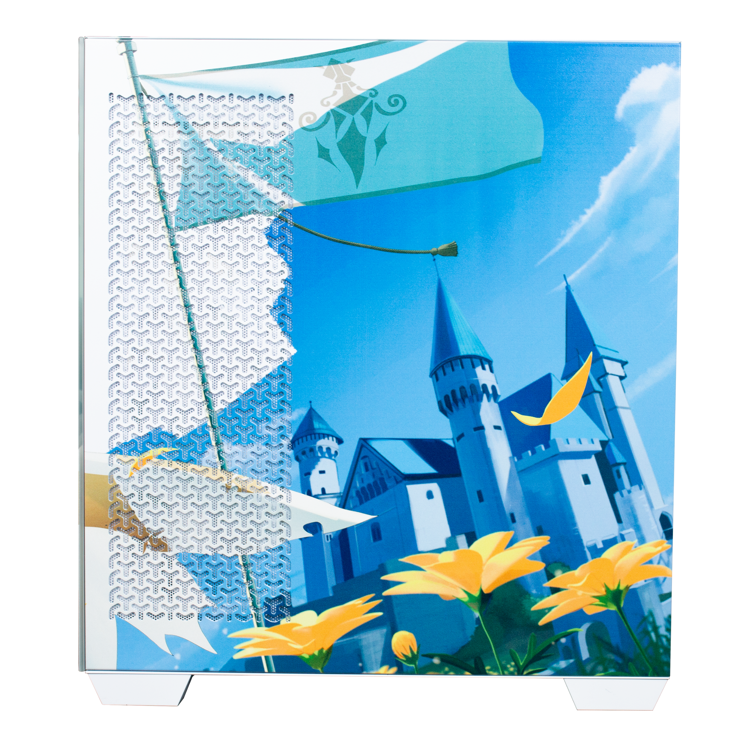 Step into Hazumi’s world of royal skies and brave horizons with this exclusive collaboration PC case. Featuring Hazumi in her heroic pose, sword in hand, and framed against a serene field and distant castle, this design captures the spirit of a noble journey. Golden petals drift across the artwork, giving the case a sense of motion and adventure worthy of a champion.