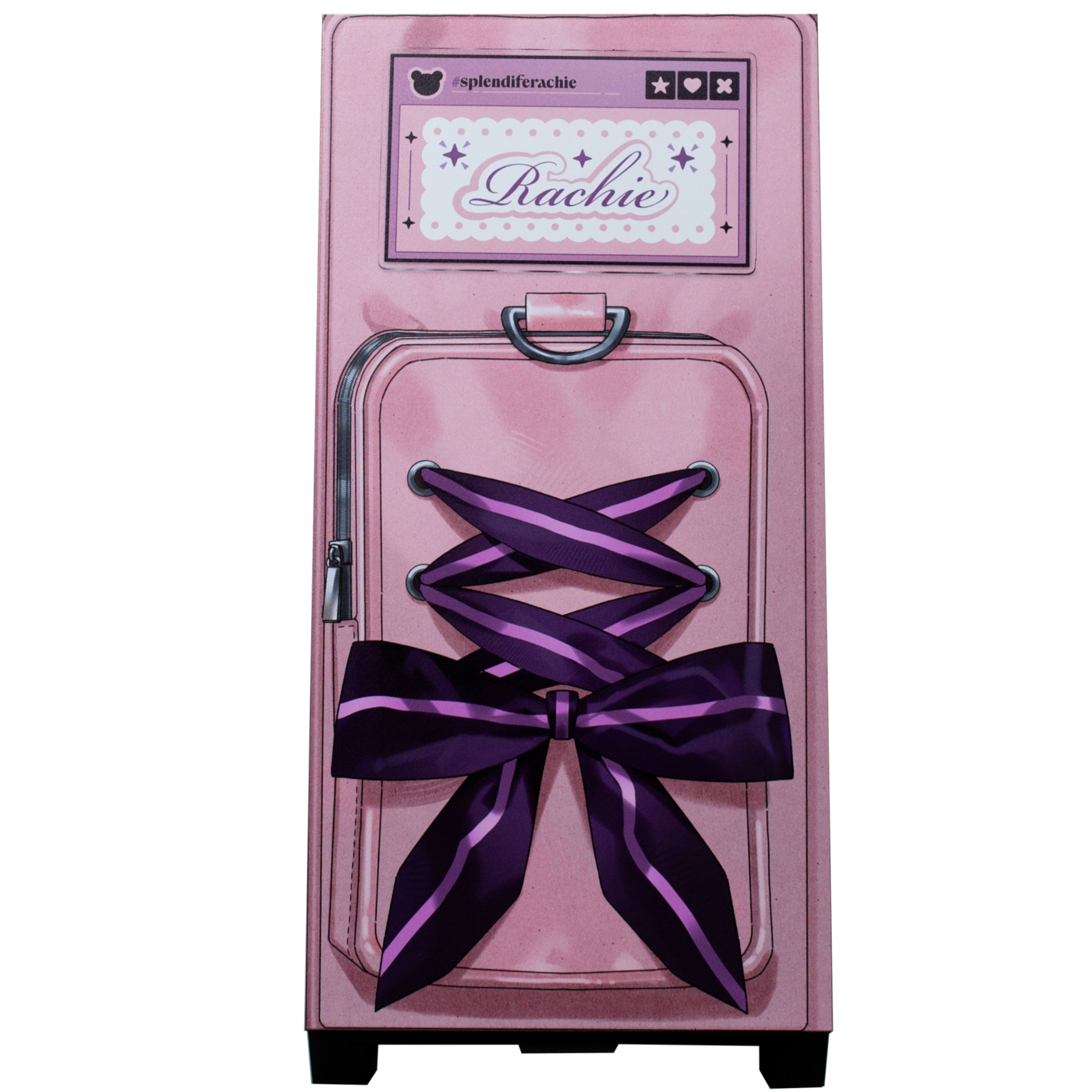 Step into the pastel charm of Rachie's world with this exclusive collaboration PC case, a heartfelt tribute to her playful aesthetic and signature pink flair. Designed to resemble a stylish Ita-bag, this case wraps your setup in ribbons, buttons, and collectible-style pins featuring Rachie and her plushie companion.